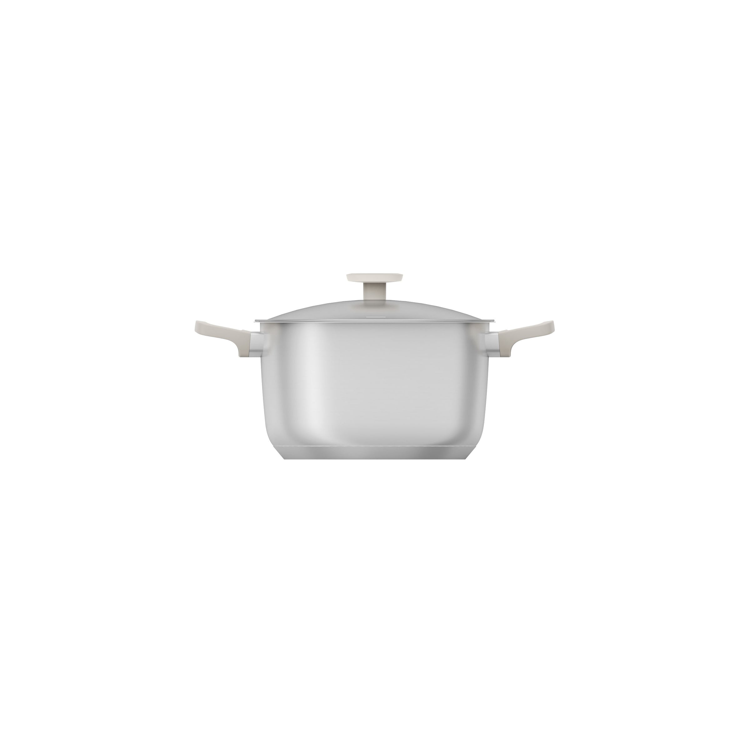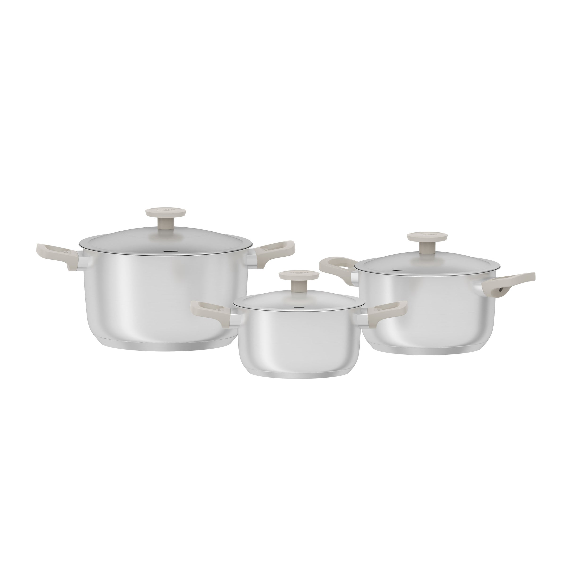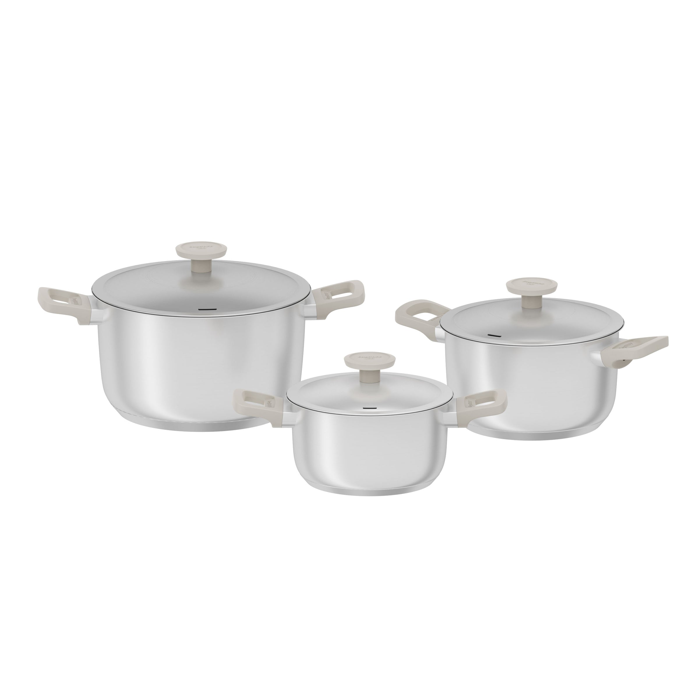 Cuisinez en toute confiance avec cet ensemble de batterie de cuisine polyvalent de 6 pièces, comprenant une marmite avec couvercle (18 cm), une marmite avec couvercle (20 cm) et un faitout avec couvercle (24 cm). Tous les éléments sont fabriqués en acier inoxydable recyclé et dotés d’un fond capsulé, garantissant une diffusion de la chaleur optimale et homogène pour préparer une grande variété de recettes. Cette élégante batterie de cuisine aux poignées aux couleurs douces est équipée d’un couvercle en acier inoxydable avec orifice d’évacuation de la vapeur.